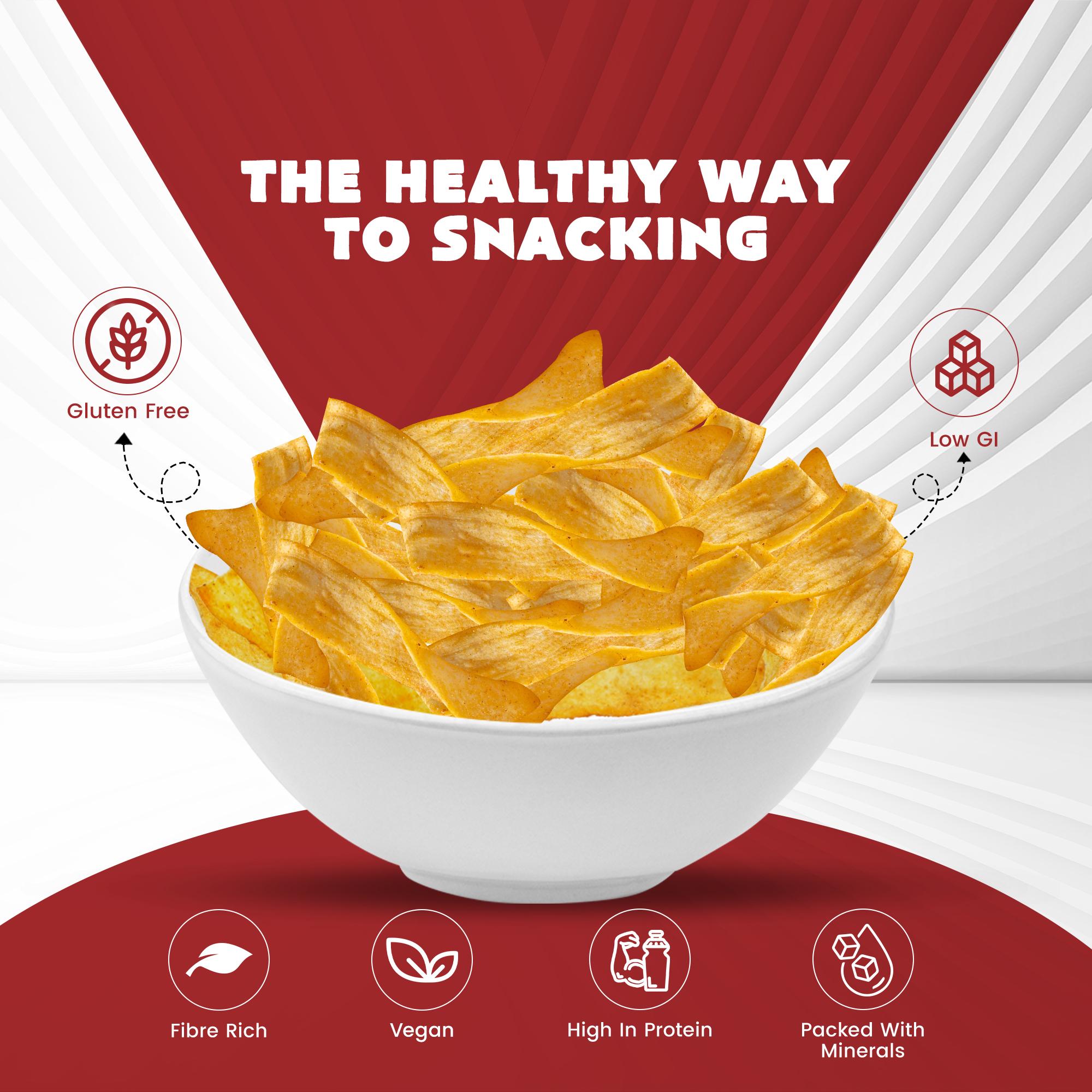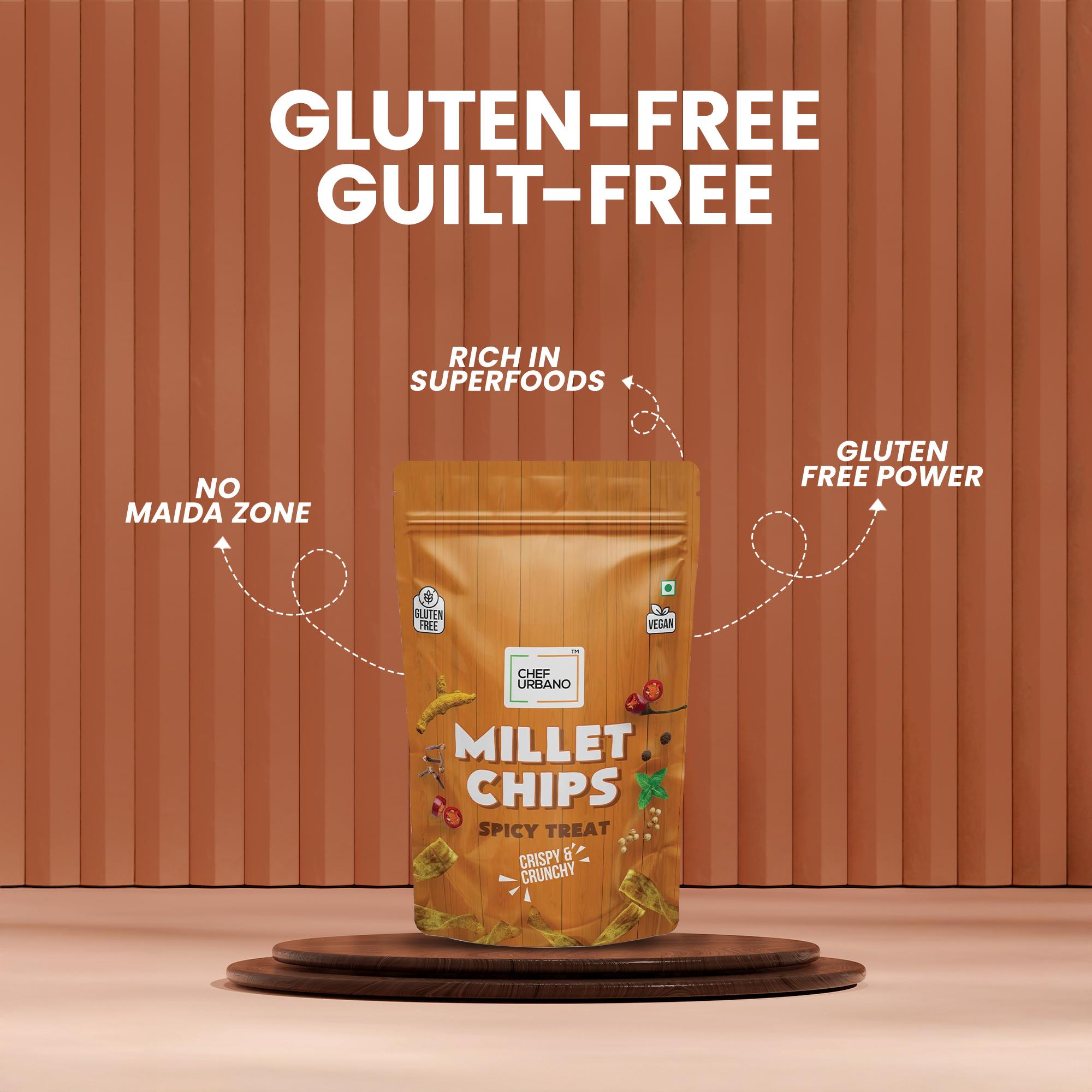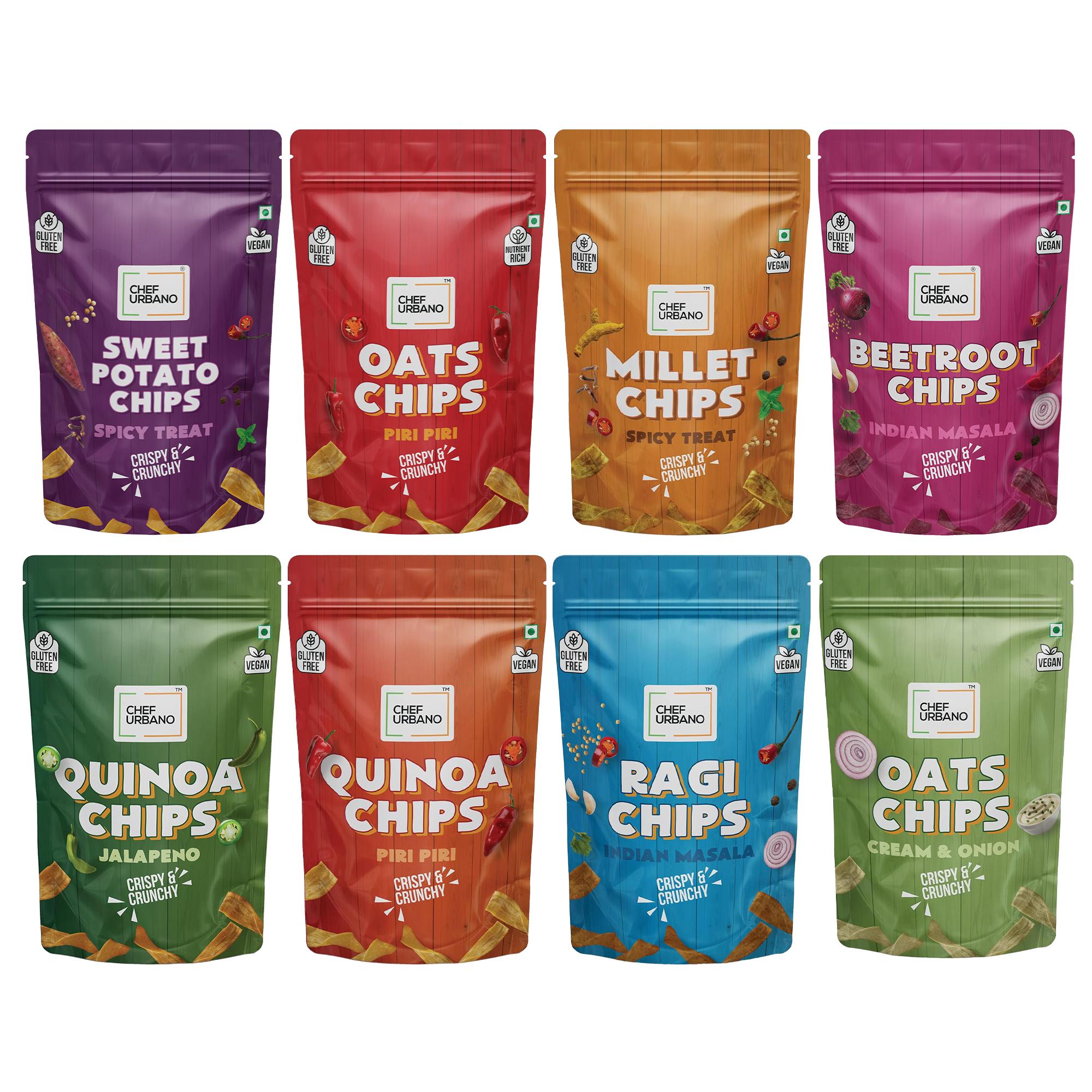 Load up your snack time with super-flavourful Chef Urbano healthy chips packed with the deliciousness of gluten free grains for an irresistible flavour and crunch that’s sure to satisfy. Made with bold seasonings, they taste so good, you may just become obsessed with them as we are! Our healthy range of chips come in the flavours of Beetroot Indian Masala Chips, Sweet Potato Spicy Treat Chips, Oats Piri Piri Chips, Millet Chips Spicy Treat, Quinoa Piri Piri Chips, Quinoa Jalapeno Chips, Ragi Indian Masala Chips and Oats Cream & Onion Chips.